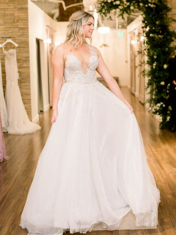Sexy V-neck A-line Lace Tulle Long Wedding Dresses Online, WDS0080
